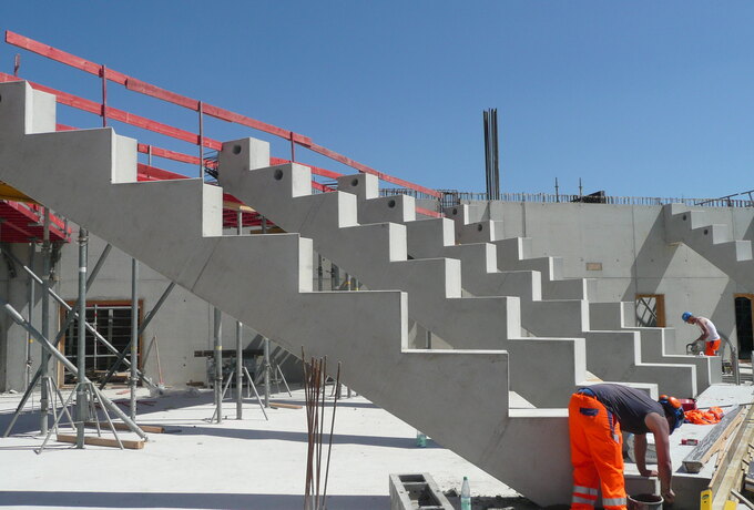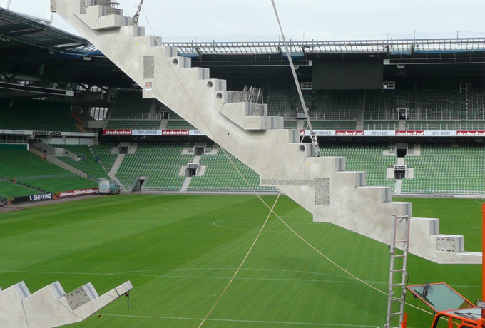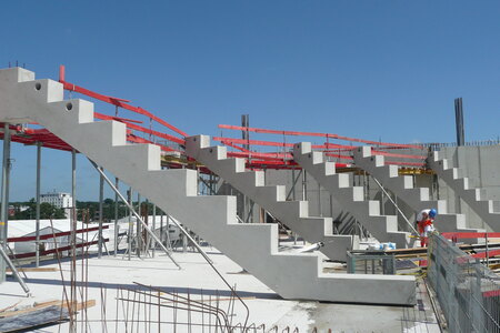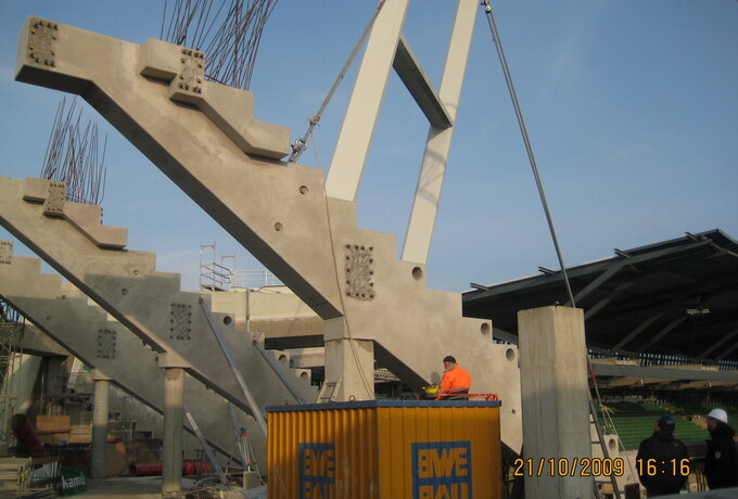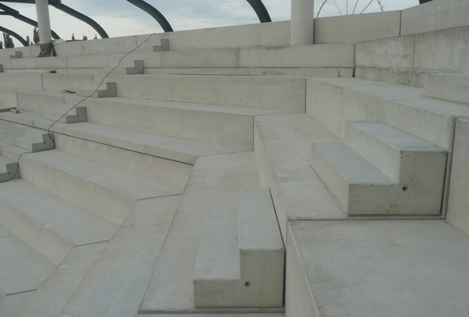 - Stahlbetonfertigteilkonstruktion aus insgesamt 735 Stück Zahnbalken, mehrstufigen Tribünenelementen, Sichtbetonfassaden, auskragende Podeste und Foyertreppen.
