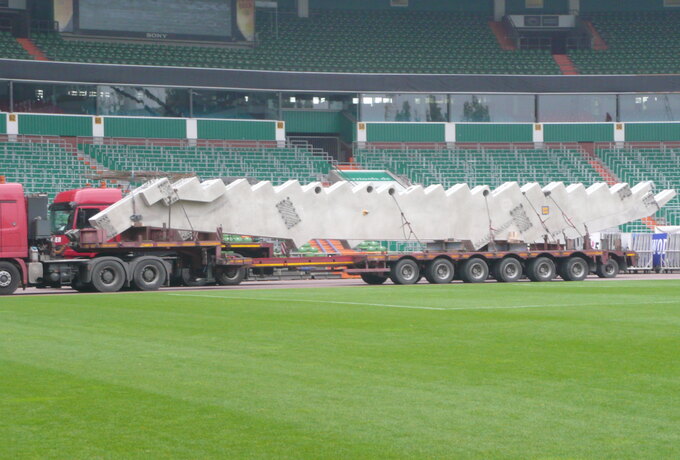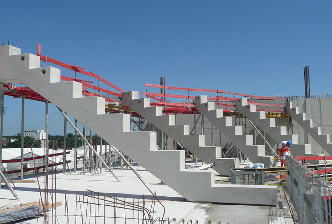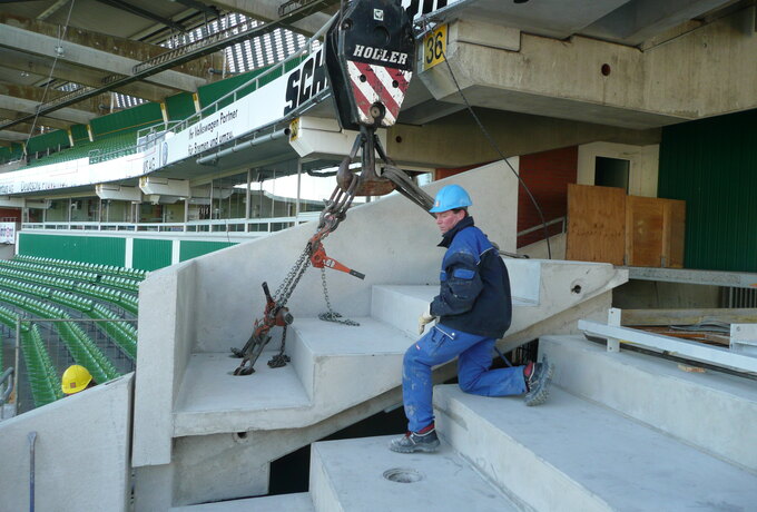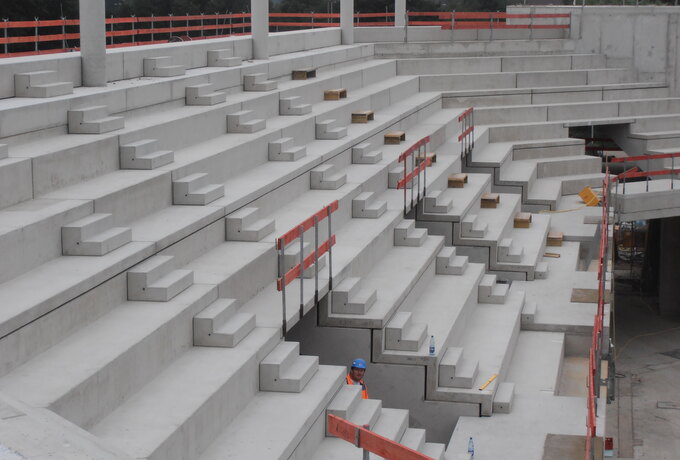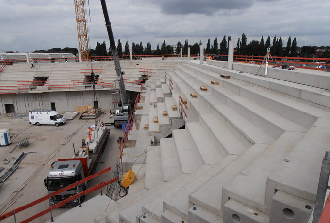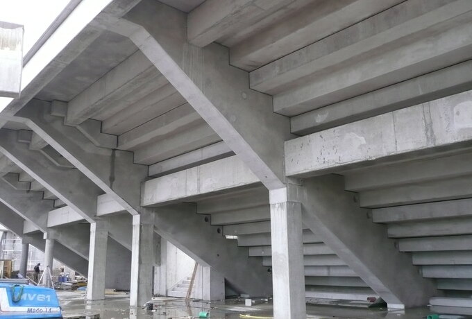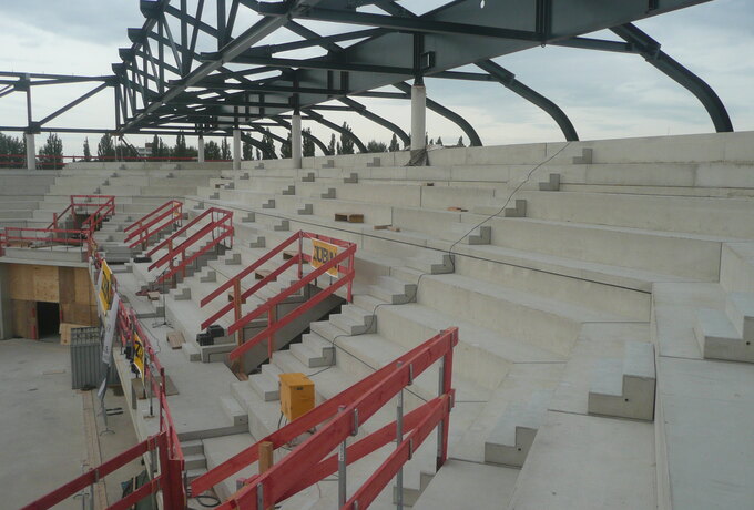 - Stahlbetonfertigteilkonstruktion aus Zahnbalken, mehrstufigen Tribünenelementen und Wandplatten.