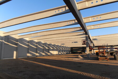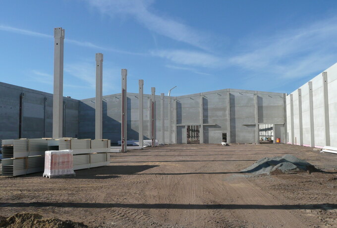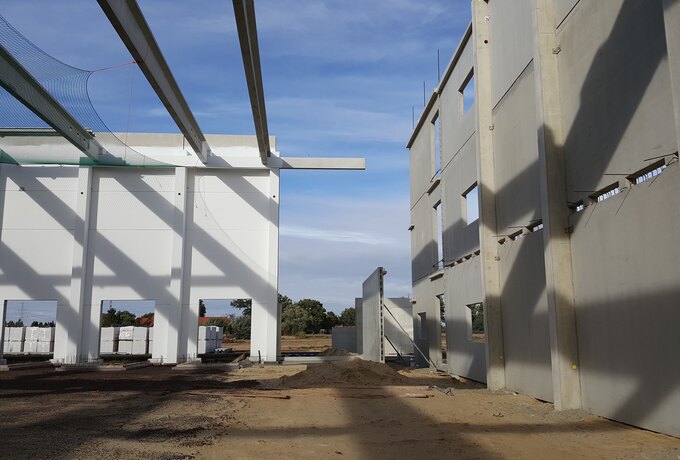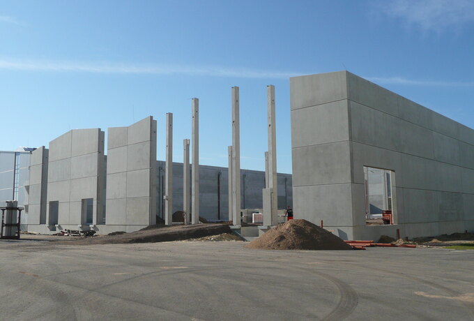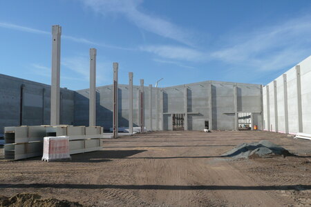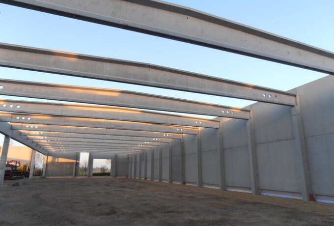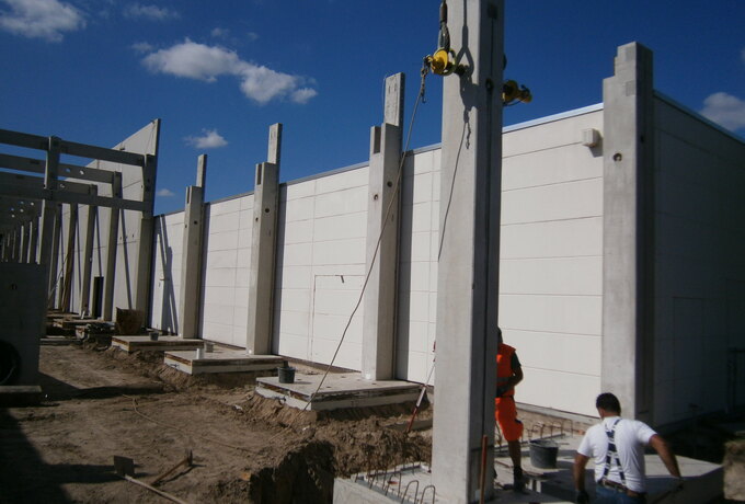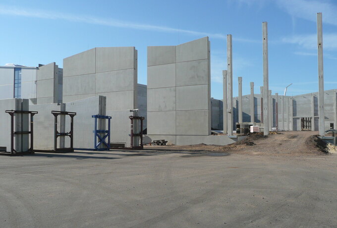 - 350 Stück konstruktive Stahlbetonfertigteile als Fassadenplatten einschichtig und gedämmt, Stützen mit angeformten Fundamenten, Unterzüge und Pfetten.