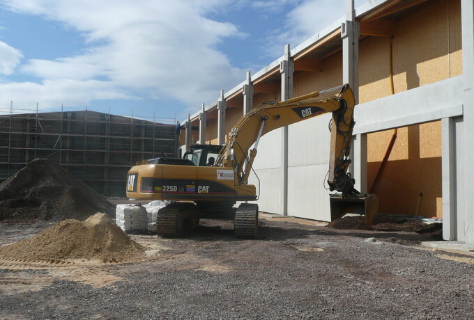 - Neben der neuen Lagerhalle und dem Neubau des Ausstellungsgebäudes entsteht zusätzlich noch ein repräsentatives Empfangsgebäude in Kombination mit Stahlbau und Ortbetonleistungen.