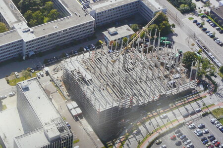 - Die Ausführung auf der Baustelle erfolgte in enger Abstimmung mit den Ortbetonarbeiten der Firma Mainka. Bei der Montage von 6 Ebenen in 3 Quadranten kamen Kräne bis 305 to mit Wippe zum Einsatz.