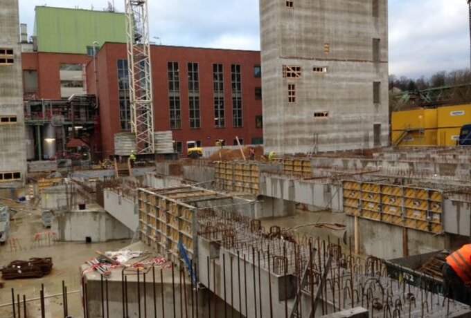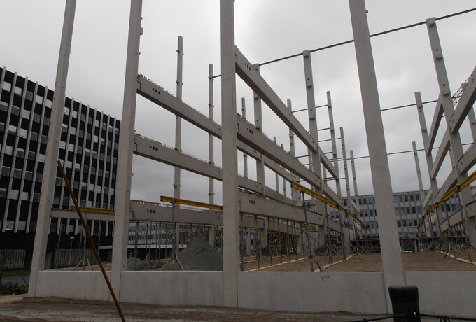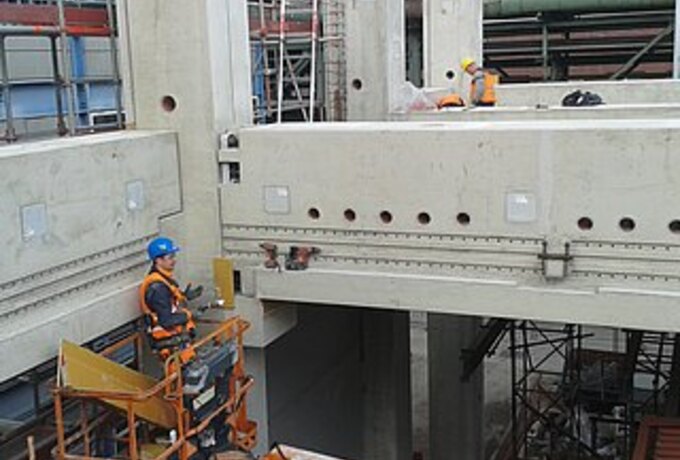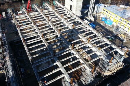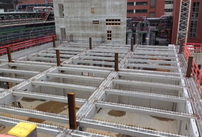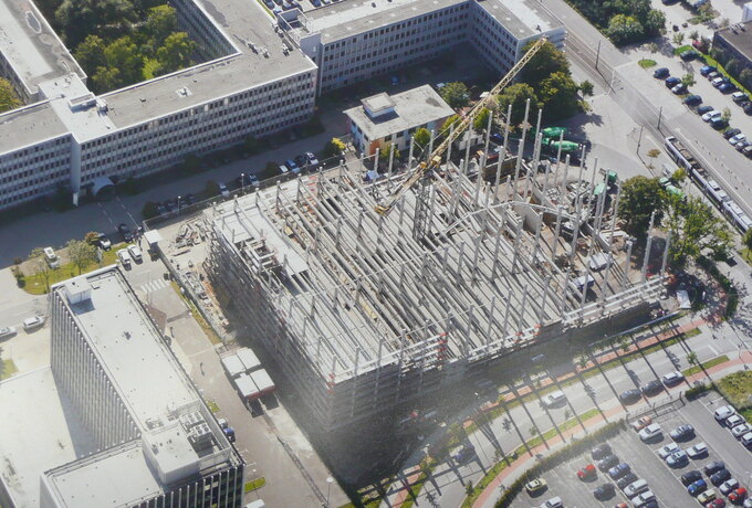 - Technische Bearbeitung, Produktion, Lieferung und Montage der Fertigteile. Die Ausführung erfolgte in Kooperation mit dem Schwesterunternehmen BFP. Die besondere Herausforderung bestand darin, die hoch bewerten Elemente biegesteif über Peikko Stützen- und Balkenschuhe miteinander zu verbinden.