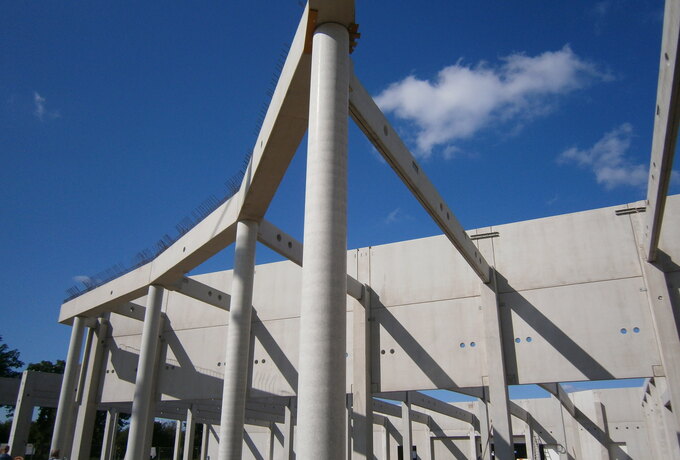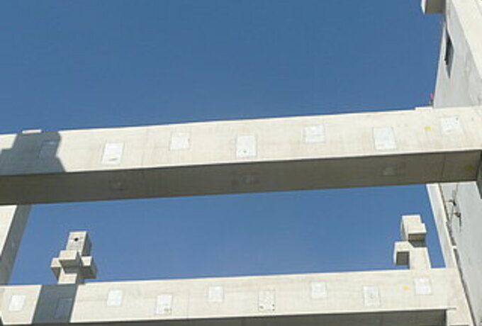 - 156 Stück konstruktive Stahlbetonfertigteile als eingespannte Stützen und Balken. Wände und Attiken.