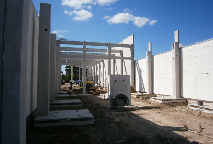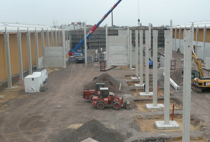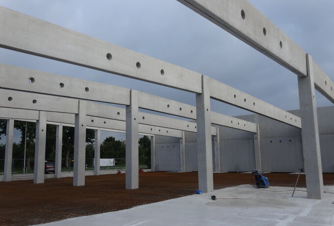 - 230 Stück konstruktive Stahlbetonfertigteile als Fassadenplatten, Stützen mit angeformten Fundamenten, Unterzüge und Pfetten.