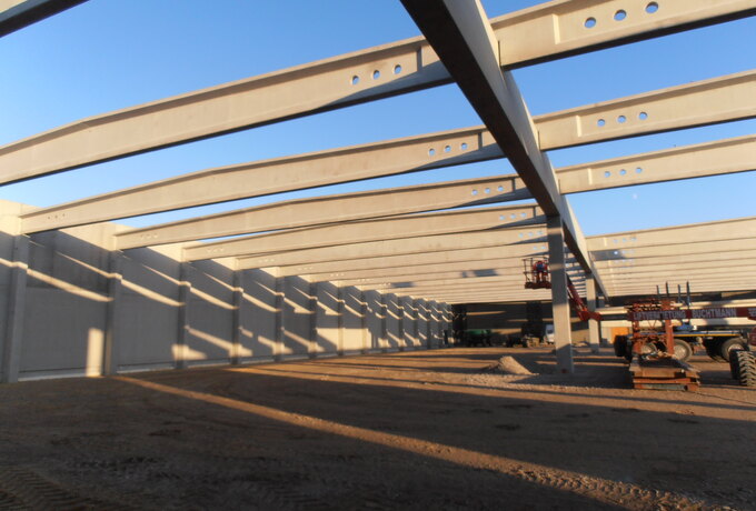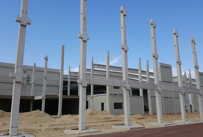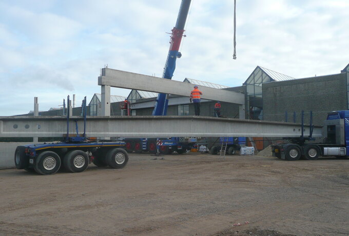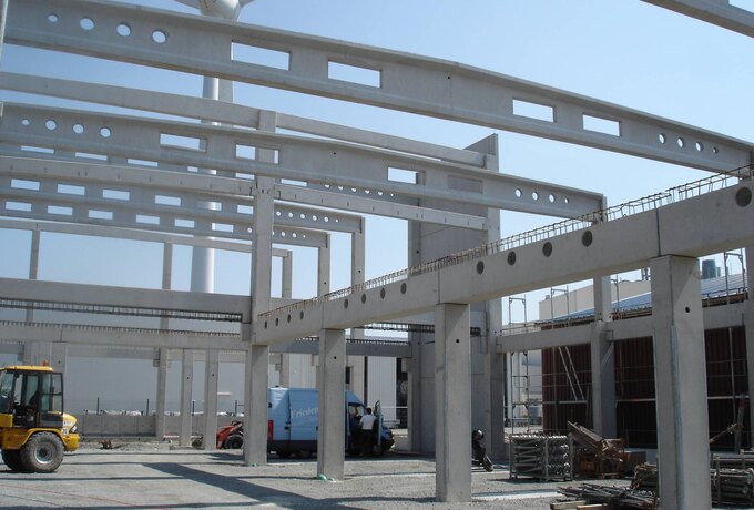 - 150 Stück konstruktive Stahlbetonfertigteile als Fassadenplatten, Stützen mit angeformten Fundamenten, Spannbetonbindern und Unterzüge