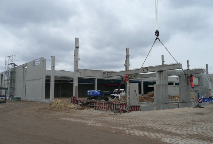 - Das BWE-Konzept zum kurzfristigen Wiederaufbau der Hallenflächen hat das führende Großhandelshaus des Zweiradhandels überzeugt und somit wurde die BWE-BAU Fertigteile GmbH mit dem Wiederaufbau der Lager- und Produktionsflächen beauftragt. Oberste Priorität hat hierbei die Einbindung des laufenden Geschäftsbetriebes sowie die termingerechte Fertigstellung der Stb.-Fertigteilkonstruktion.